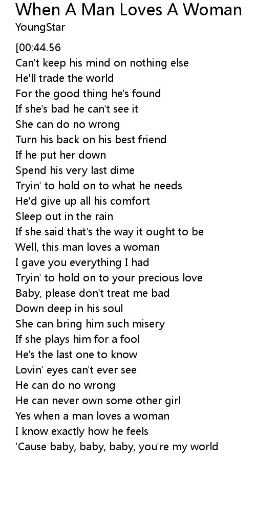 | [00:16.34][00:44.56][01:45.84][02:15.82][02:46.66] | When a man loves a woman |