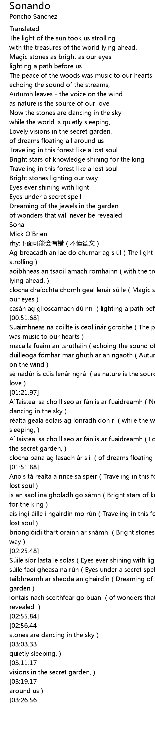 | [01:22.26] | A Taisteal sa choill seo ar fá n is ar fuaidreamh Now the stones are dancing in the sky |