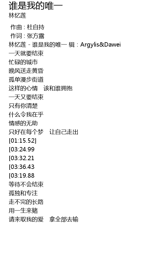 | [03:59.90][03:36.43][03:13.20][02:19.28][01:29.09] | 谁是我的唯一 |