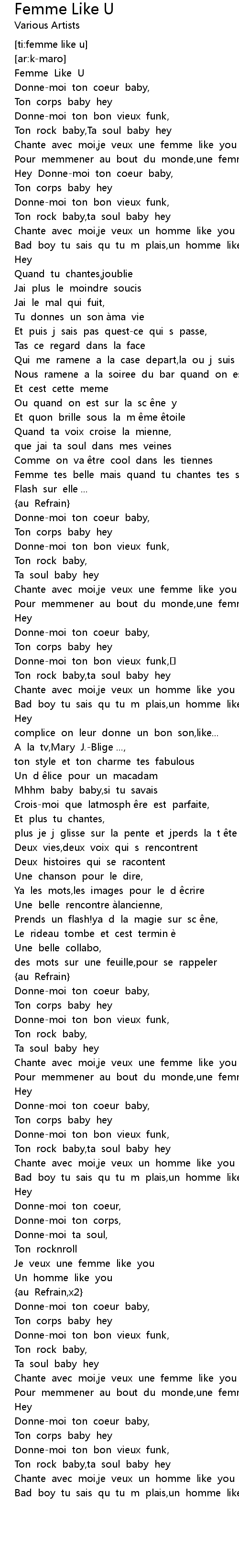 | [03:31.297] | Chante avec moi, je veux une femme like you |