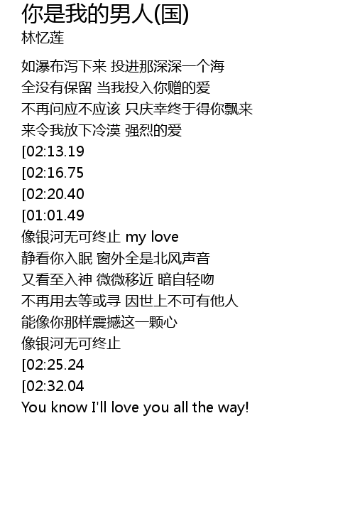 | [02:01.43][01:01.49] | You are my man! ai ni shi ren sheng yi yi |