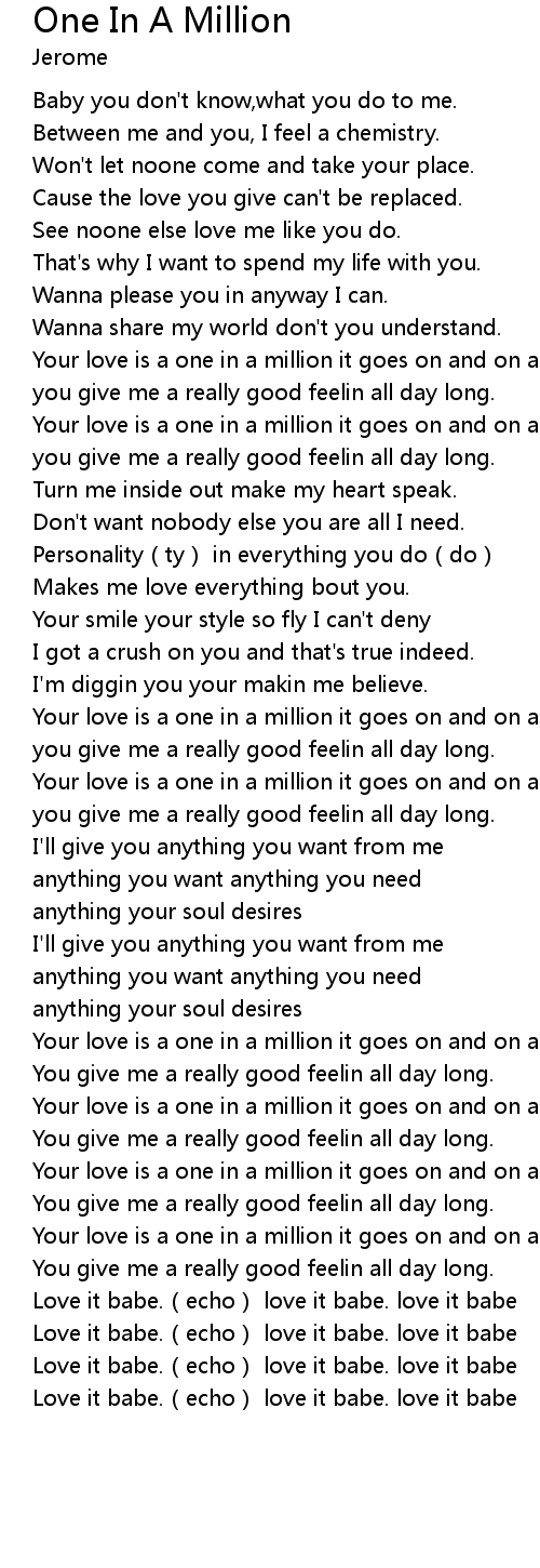 | [00:48.60] | Your love is a one in a million it goes on and on and on |