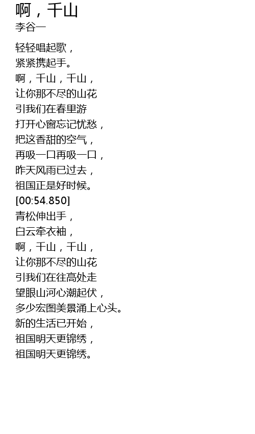 | [00:18.800] | a, qiān shān, qiān shān, |