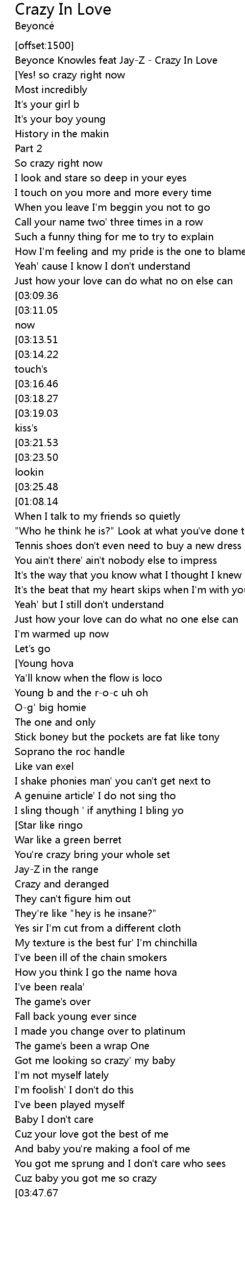 | [00:00.61] | Beyonce Knowles feat Jay-Z - Crazy In Love |