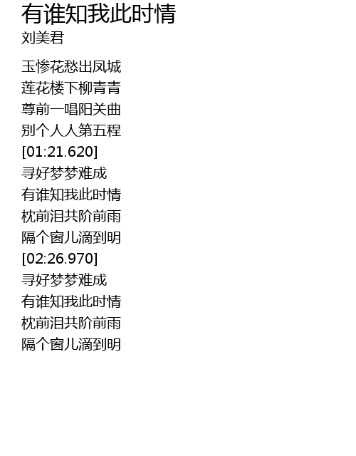 | [01:48.410] | yǒu shéi zhī wǒ cǐ shí qíng |