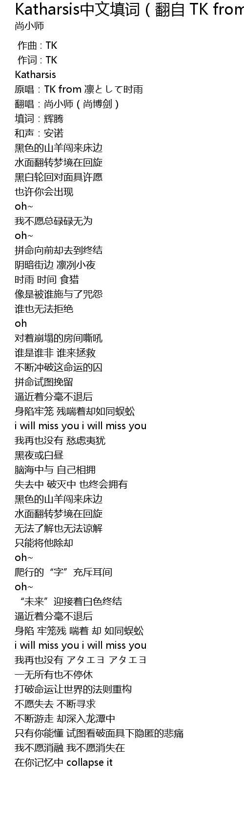 | Song | Katharsis中文填词(翻自 TK from 凛として時雨) |
