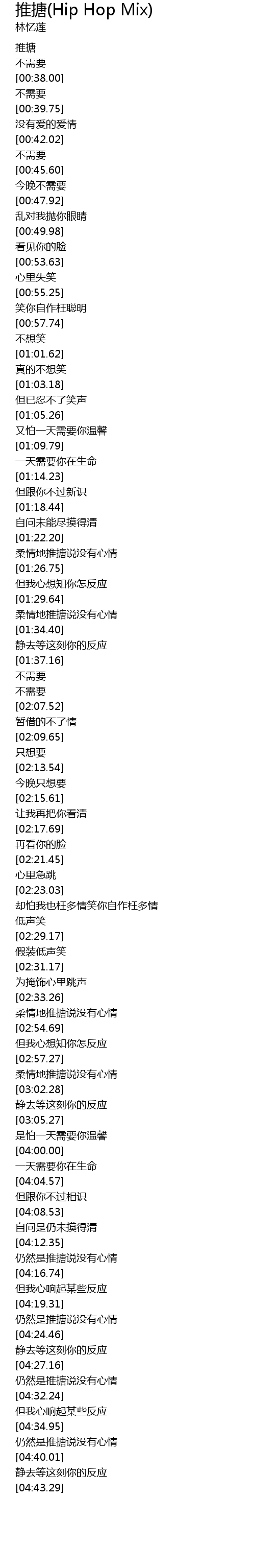 | [04:36.62] | réng rán shì tuī táng shuō méi yǒu xīn qíng |