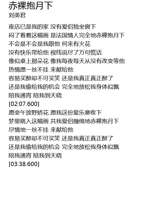 | [00:37.599] | 闷了看着这幅画 是法国情人完全地赤裸抱月下 |