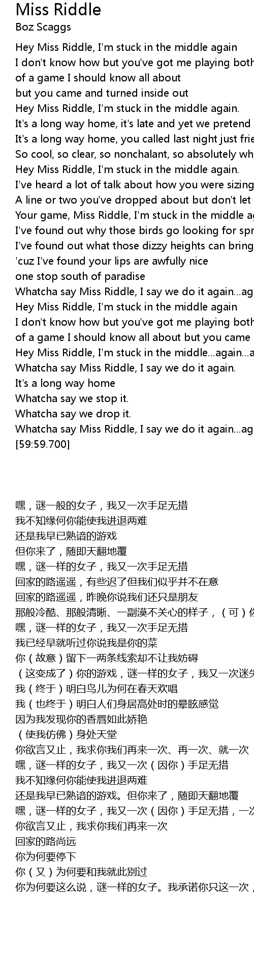 | [00:33.220] | Hey Miss Riddle, I' m stuck in the middle again |