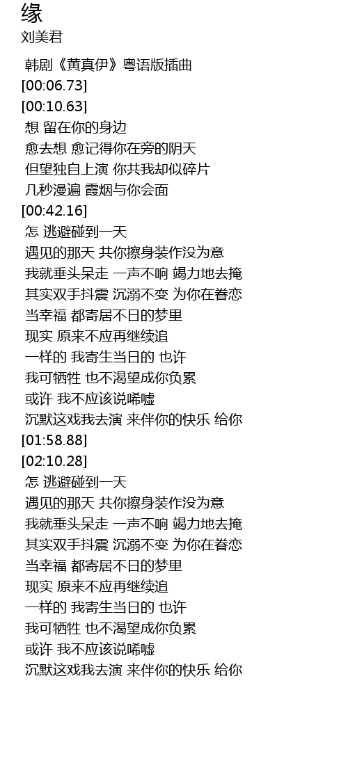 | [00:05.27] | 韩剧《黄真伊》粤语版插曲 |