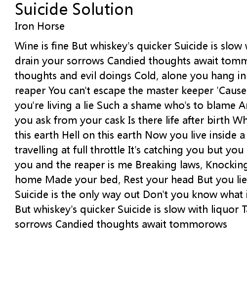 Wine is fine But whiskey's quicker Suicide is slow with liquor Take a bottle drain your sorrows Candied thoughts await tommorows Await tommorows Evil thoughts and evil doings Cold, alone you hang in ruins Thought you'd escape the reaper You can't escape the master keeper 'Cause you feel life's unreal And you're living a lie Such a shame who's to blame And you're wondering why Then you ask from your cask Is there life after birth What you saw can mean hell on this earth Hell on this earth Now you live inside a bottle The reaper's travelling at full throttle It's catching you but you don't see The reaper is you and the reaper is me Breaking laws, Knocking doors But there's no one at home Made your bed, Rest your head But you lie there and moan Where to hide, Suicide is the only way out Don't you know what it's really about Wine is fine But whiskey's quicker Suicide is slow with liquor Take a bottle drown your sorrows Candied thoughts await tommorows