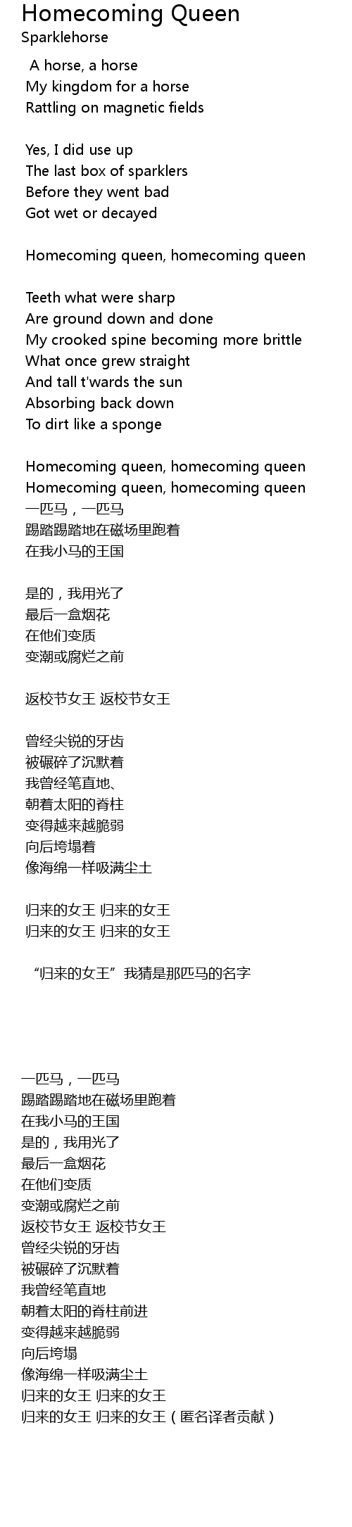 | " guī lái de nǚ wáng" wǒ cāi shì nà pǐ mǎ de míng zì |