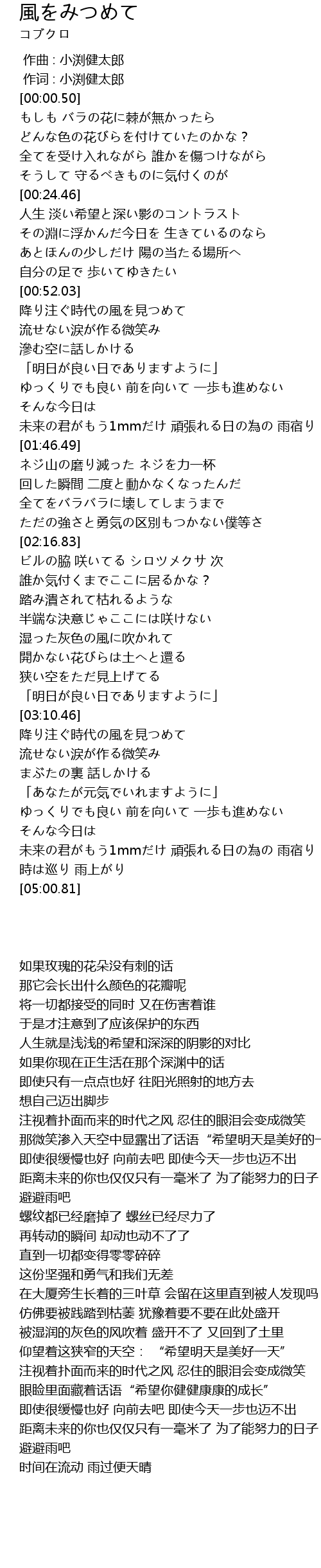 | [03:55.00] | まぶたの裏 話しかける 「あなたが元気でいれますように」 |