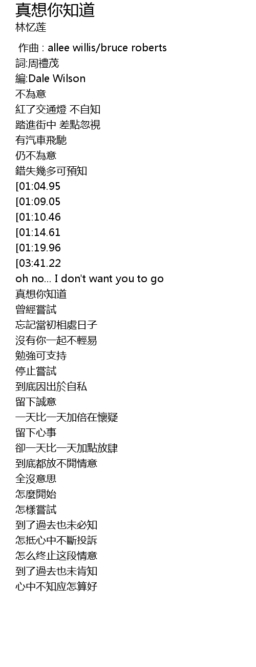 | [04:03.17][03:41.22][02:30.41][01:24.86] | That I don' t want you to go |