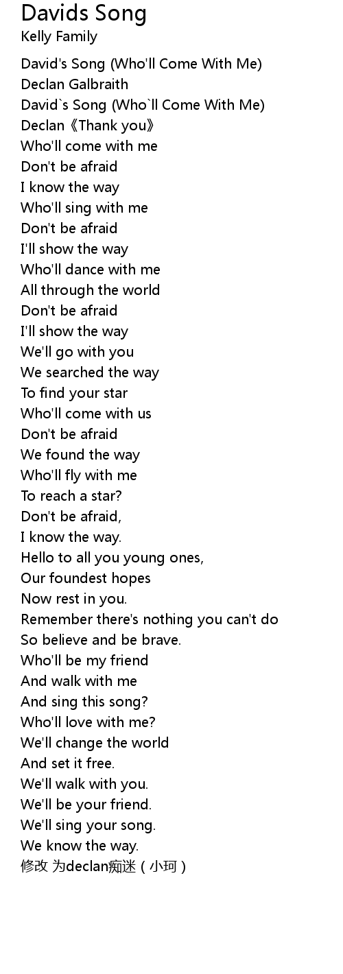 | [00:01.00] | David`s Song (Who`ll Come With Me) |