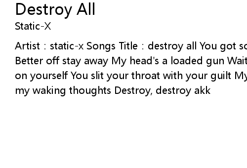 | [00:00.83] | Artist:static-x Songs Title:destroy all You got something to say Better off stay away My head's a loaded gun Waiting to go off You keep your eyes on yourself You slit your throat with your guilt My hands are ringing necks In my waking thoughts Destroy, destroy akk |