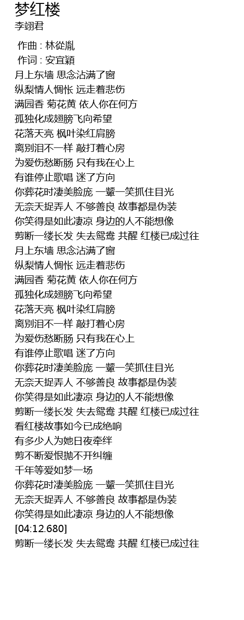 | [04:13.380] | 剪断一缕长发 失去鸳鸯 共醒 红楼已成过往 |