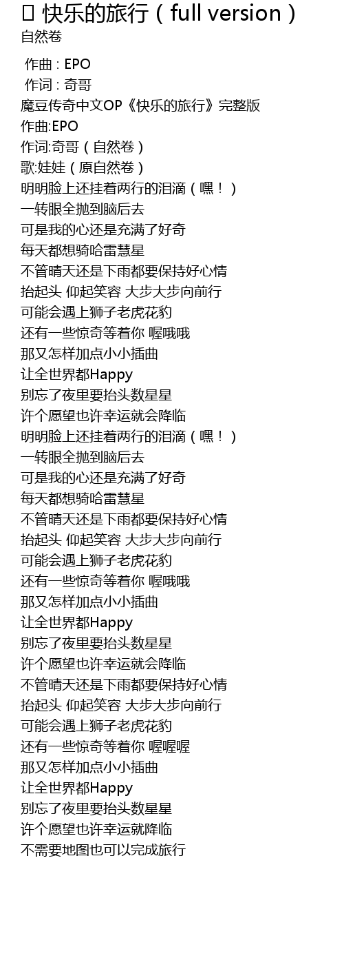 | [00:00.000] | 魔豆传奇中文OP《快乐的旅行》完整版 |