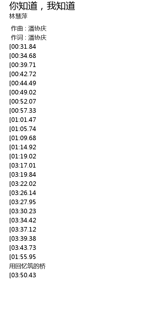 | [04:18.72][03:39.38][01:47.66] | 你知道我知道 |