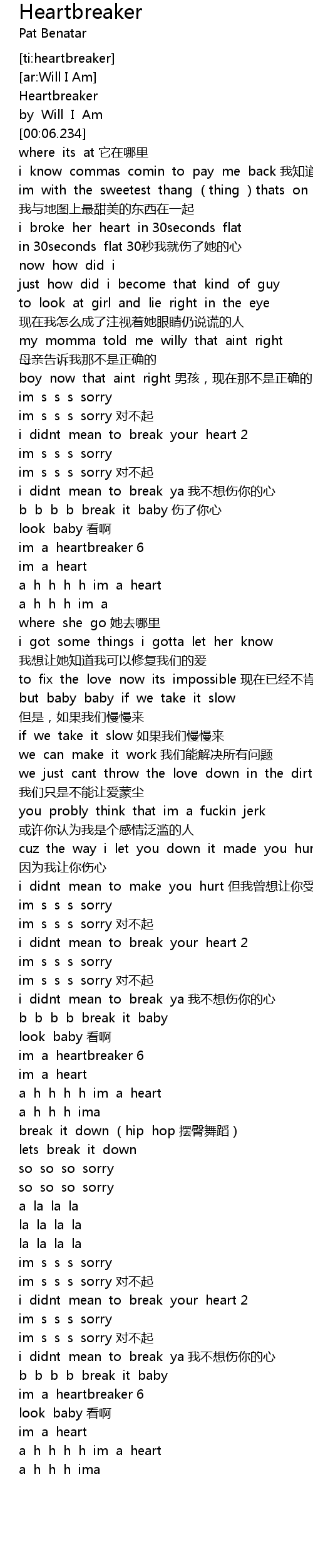 | [03:26.332]im a heartbreaker 6] | wǒ shì yí gè lìng rén shāng xīn de rén |