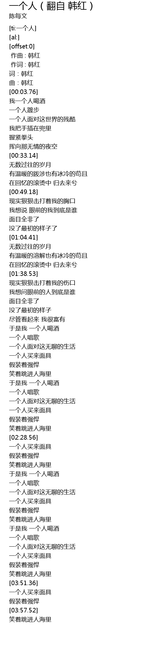 | [00:17.88] | wǒ yí ge rén hē jiǔ |