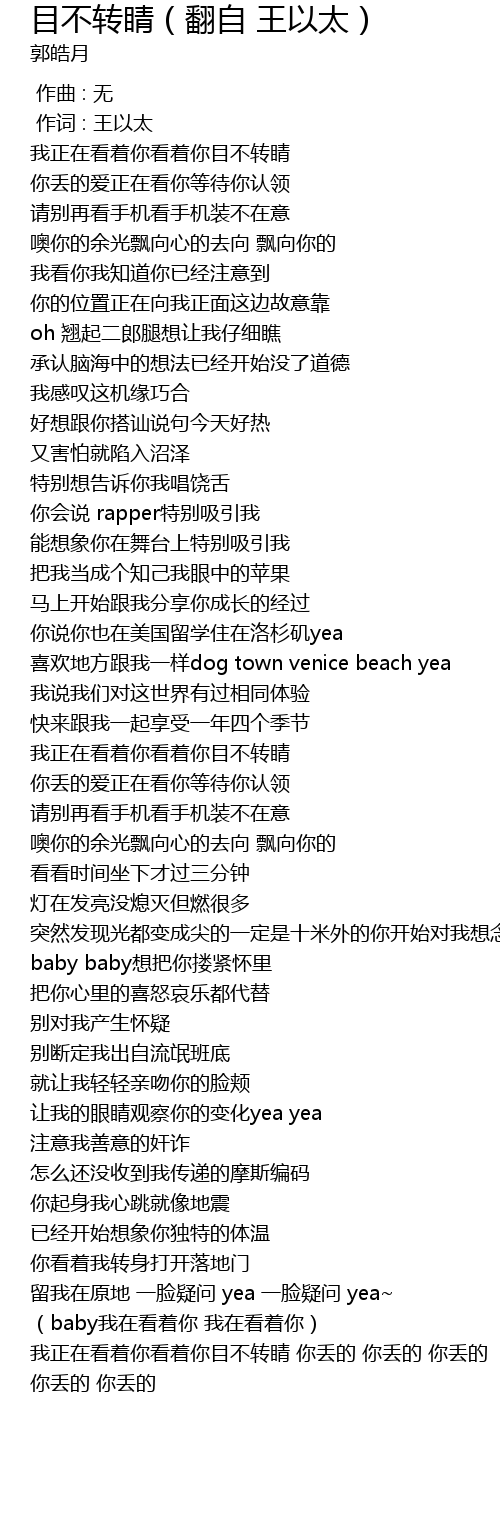 | [02:29.181] | 我正在看着你看着你目不转睛 你丢的 你丢的 你丢的 你丢的 你丢的 |