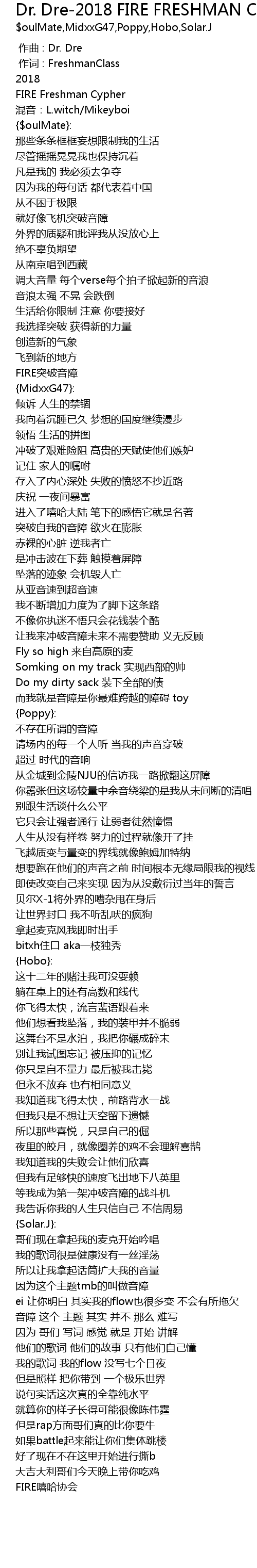 | Song | Dr. Dre-2018 FIRE FRESHMAN CYPHER($oulMate / MidxxG47 / Poppy / Hobo / Solar.J remix) |