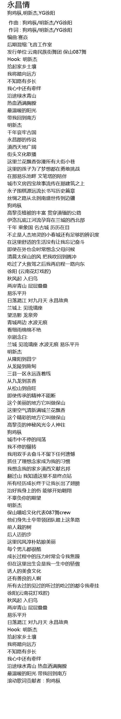 | [00:00.714] | 作词 : 狗鸡枞/明新杰/YG徐阳 |