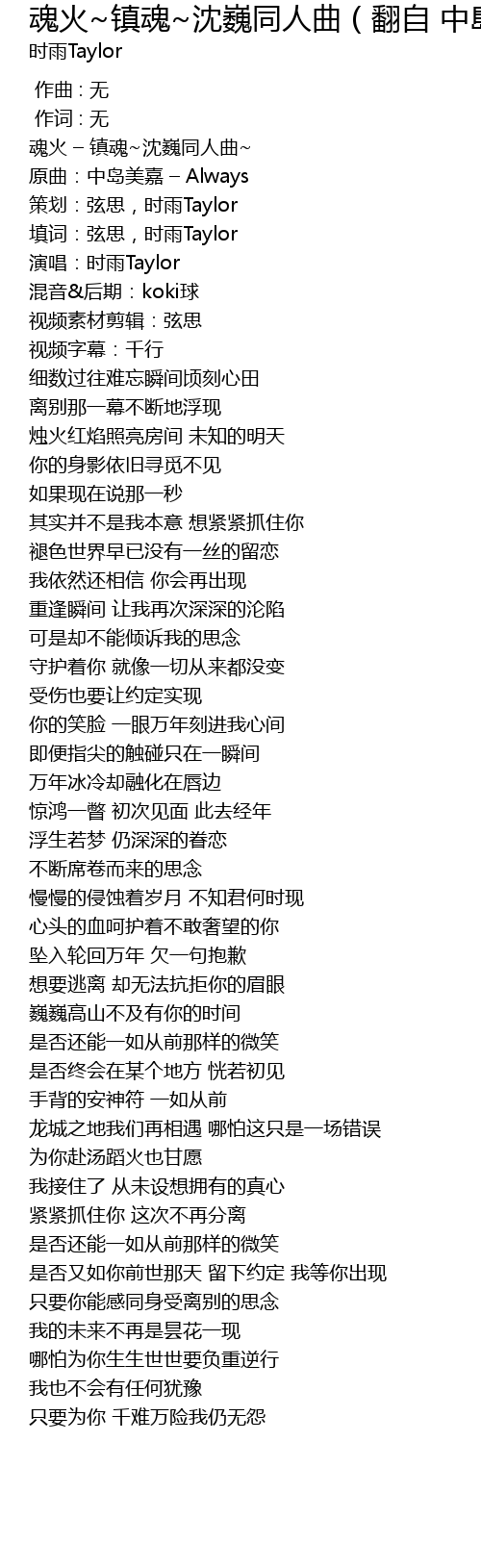 | [00:03.175] | 魂火 – 镇魂~沈巍同人曲~ |