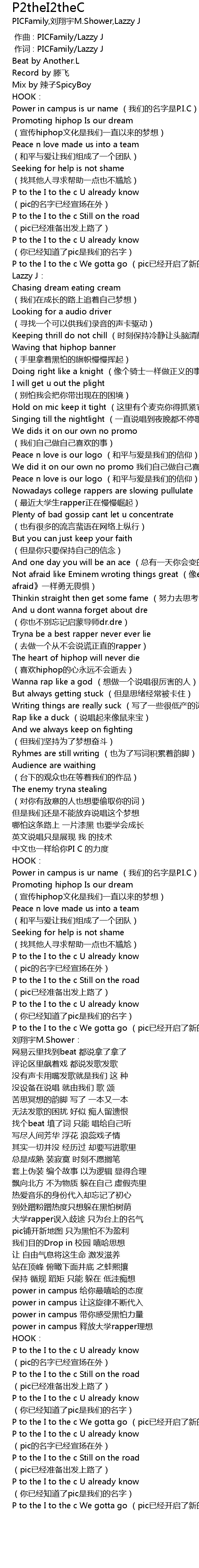 | [01:44.520] | Power in campus is ur name (我们的名字是P.I.C) |