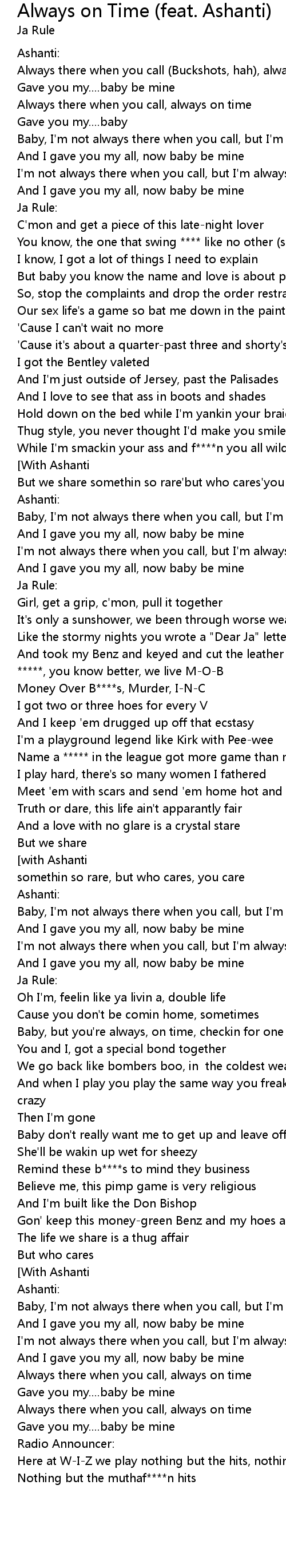 | [01:19.504] | Baby, I'm not always there when you call, but I'm always on time |