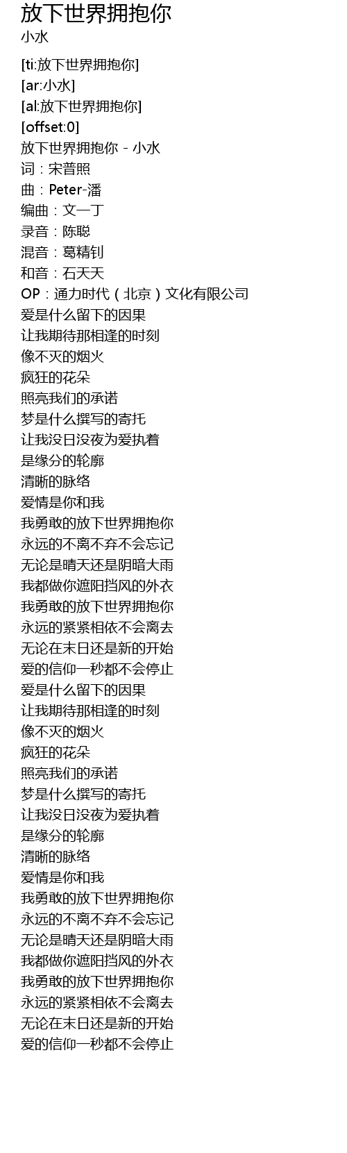 | [00:00.64] | 放下世界拥抱你 - 小水 |
