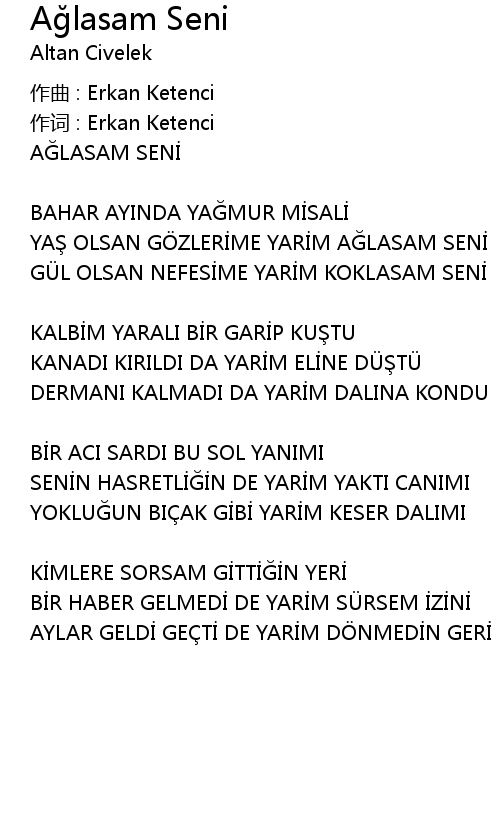 | YAŞ OLSAN GÖZLERİME YARİM AĞLASAM SENİ | |