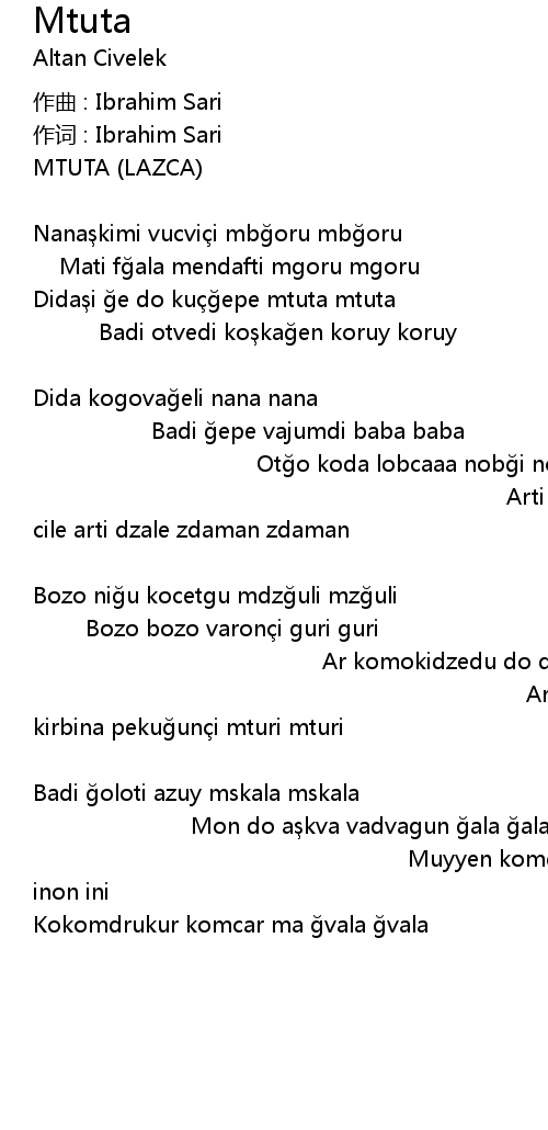 | Bozo niğu kocetgu mdzğuli mzğuli Bozo bozo varonçi guri guri Ar komokidzedu do dzidzu mdzidzu Ar kirbina pekuğunçi mturi mturi | |