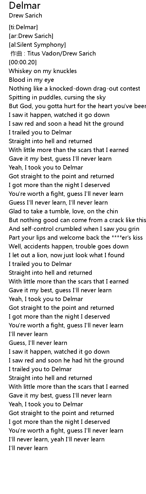| [00:39.30] | I trailed you to Delmar |