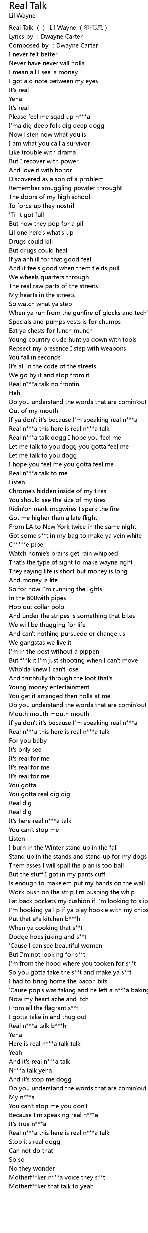 | [00:00.00] | Real Talk ()-Lil Wayne (尔·韦恩) |