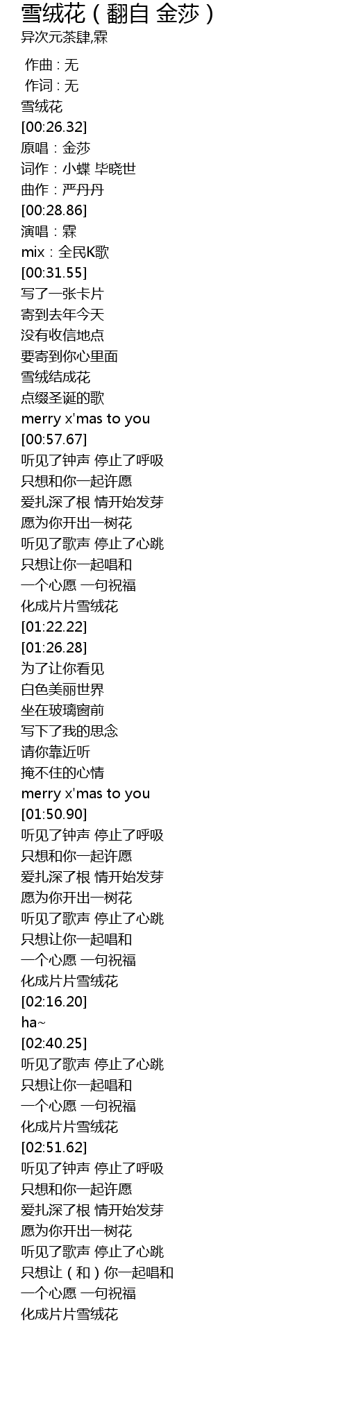| [02:10.26] | huà chéng piàn piàn xuě róng huā |