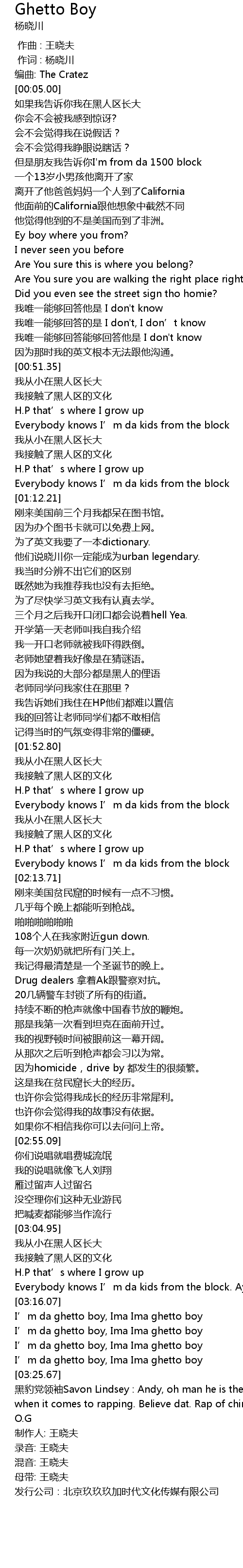 | [03:30.04] | 黑豹党领袖Savon Lindsey : Andy, oh man he is the greatest ever when it comes to rapping. Believe dat. Rap of china, yea the Rap of china. Yea O.G |