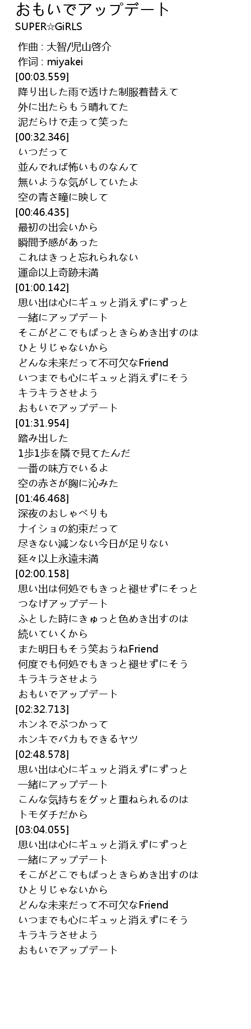 | [03:04.299] | 思い出は心にギュッと消えずにずっと |