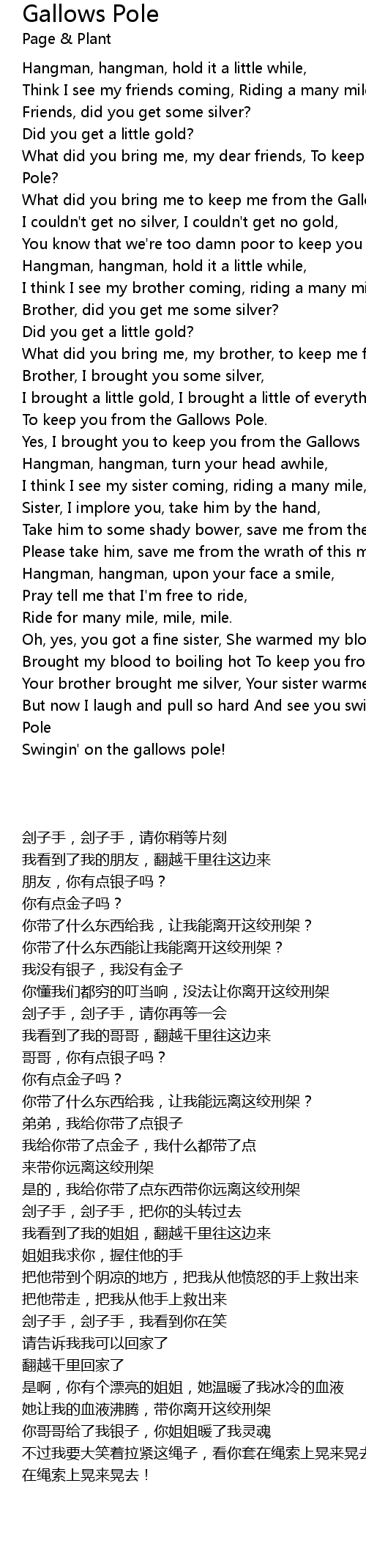 But now I laugh and pull so hard And see you swinging on the Gallows Pole |