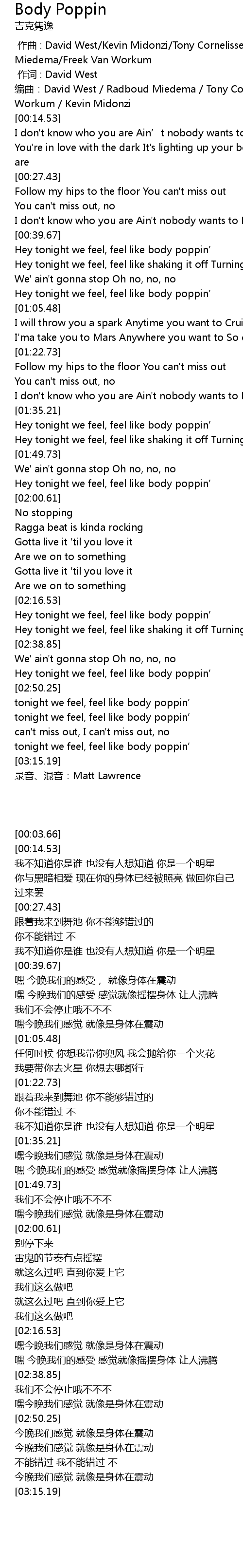 | [00:58.40] | Hey tonight we feel, feel like body poppin’ |