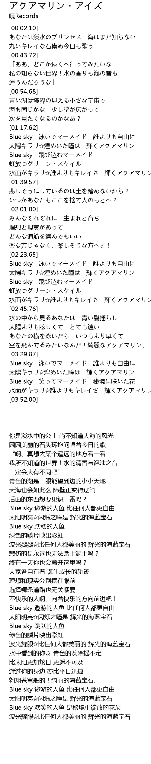 | [02:23.66] | Blue sky 泳いでマーメイド 誰よりも自由に |