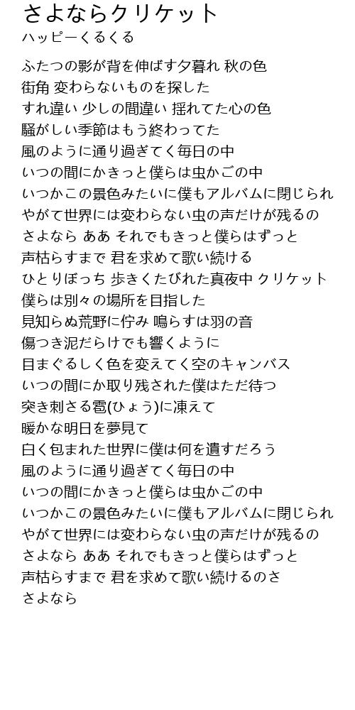 | [01:39.36] | ひとりぼっち 歩きくたびれた真夜中 クリケット |