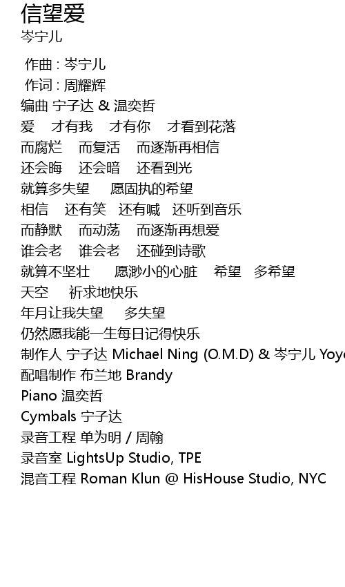 | [03:03.08] | 制作人 宁子达 Michael Ning (O.M.D) & 岑宁儿 Yoyo Sham |