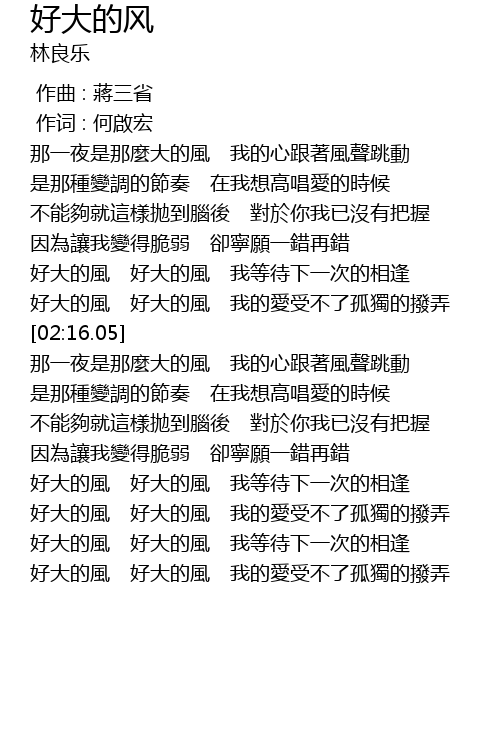 | [01:30.60] | 好大的風 好大的風 我的愛受不了孤獨的撥弄 |