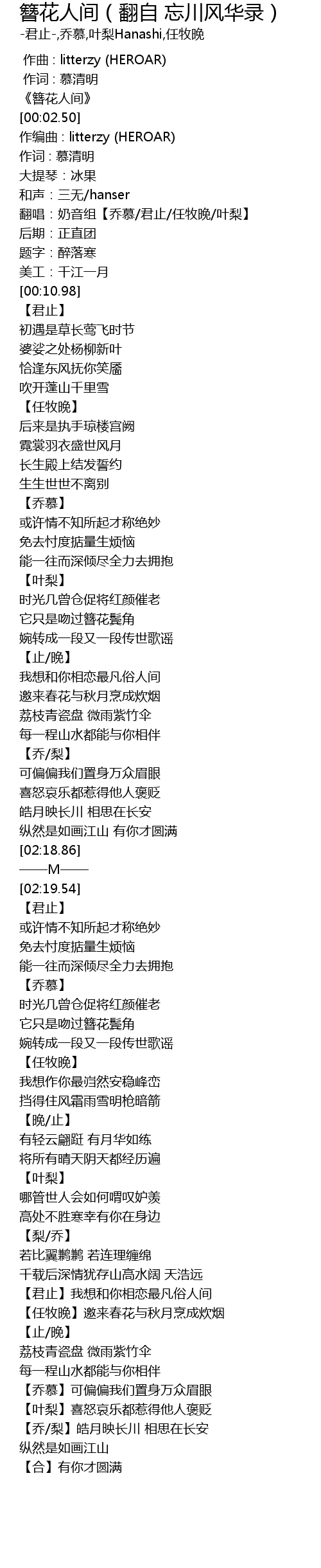 | [00:07.40] | 翻唱:奶音组【乔慕/君止/任牧晚/叶梨】 |