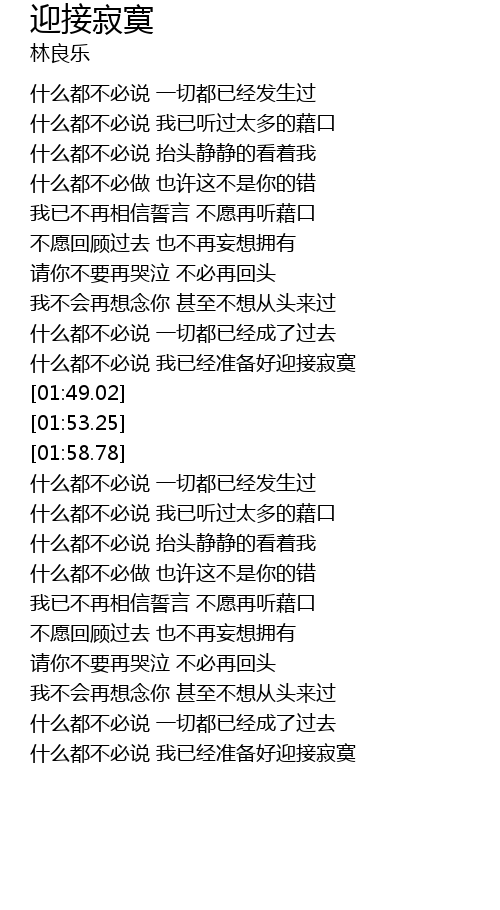 | [03:08.45] | 什么都不必说 我已经准备好迎接寂寞 |