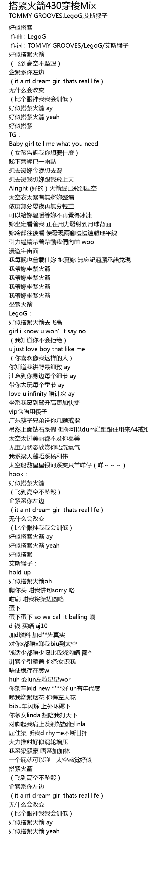 | [00:01.000] | 作词 : TOMMY GROOVES/LegoG/艾斯猴子 |