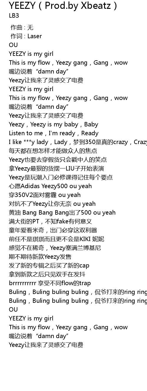 | [00:37.992] | Yeezy ràng wǒ lái le líng gǎn jiāo le diàn fèi |