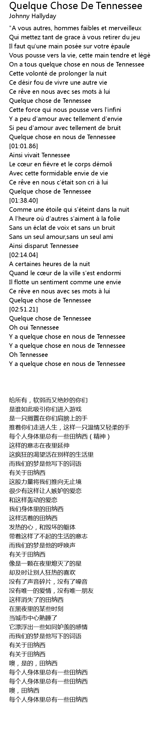| [00:57.40] | Quelque chose en nous de Tennessee |